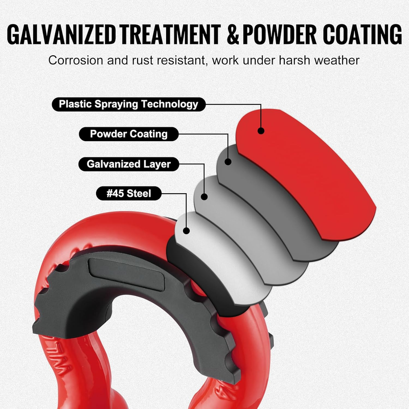 The bow shackle features triple-layer surface treatment: galvanization, powder coating, and heat treatment, enhancing its resistance to rust and corrosion. It's built to thrive in harsh conditions.
