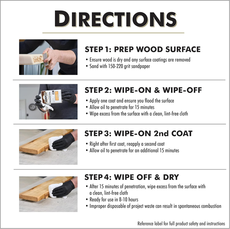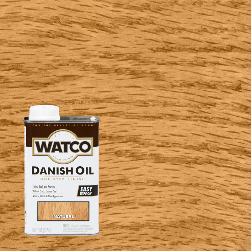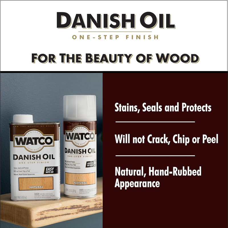 Watco Danish Oil Wood Finish stains, seals, and protects in one easy step to produce a warm, natural hand rubbed appearance. Simply brush or wipe on and wipe off to allow the penetrating oil to soak into your wood surface and protect from within. Offers superior performance on tight grained woods.