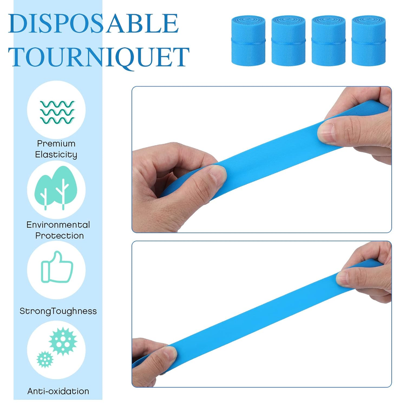 Widely Applicable in Daily Life: the elastic disposable tourniquet is applicable for various occasions, including but not limited to classroom, school, nurse room, home, office, kindergarten and public area