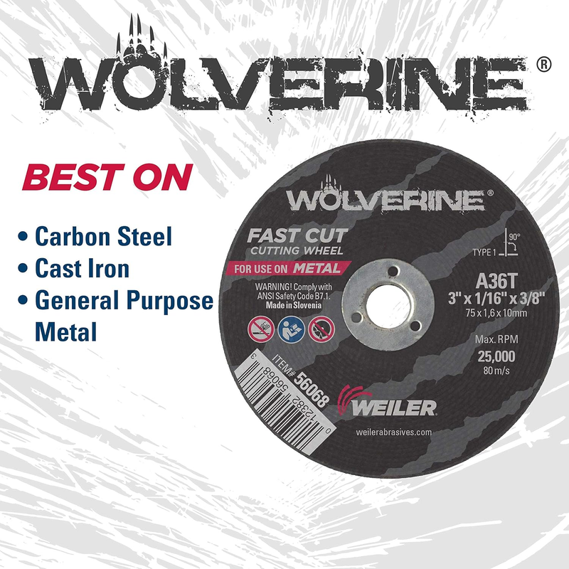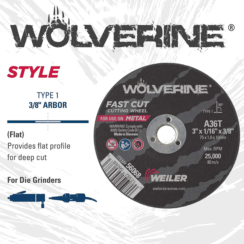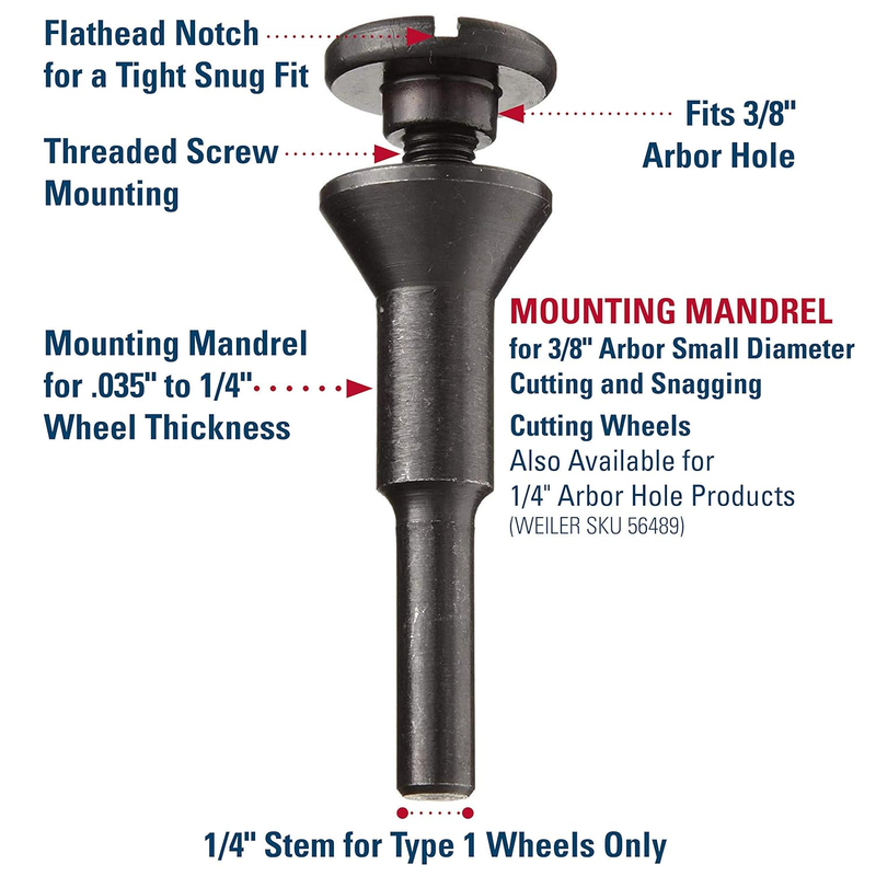 Weiler Mounting Mandrel for Cut-off Wheels with 3/8" Arbor Hole and 1/4" Stem. The 10 Wolverine cut-off wheels are made with a resin-bond formulated for aggressive stock removal and fast cutting. This bundle includes 1 Mandrewl and 10 3" Wolverine Cutting Discs. Weiler is a 4th Generation Family-Owned compay headquartered in Cresco, PA. Click on the Weiler link at the top of this page to visit the Weiler Brand Store.