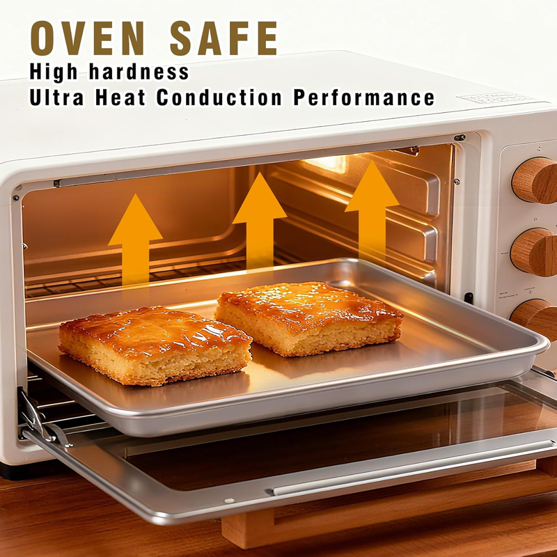 ?Non-stick Baking Sheet Pans for Oven - Including 2pcs quarter baking pans. (SIZE: 11 x 9 x 1 inch) with durable nonstick coating which helps ensure quick effortless food release. Our cookie baking sheets are 0.8MM thicker. The design can help heat distribution quickly and evenl.