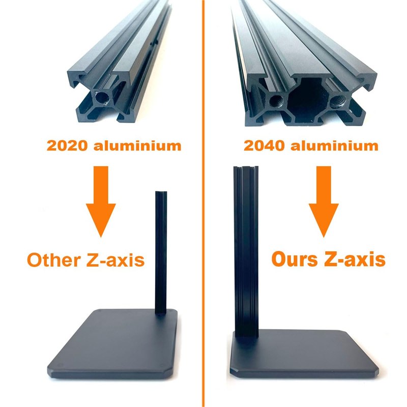 The base is made by bending and welding sheet metal, and reinforced welding is added at the bottom, equipped with anti slip foot pads. The Z-axis is a widened 2040 aluminum profile, which provides sufficient strength when the structure is pressed down. Three large V-shaped pulleys are tightly matched with the 2040 aluminum profile, and only one V-shaped pulley needs to be adjusted to clamp the aluminum profile. The metal tension spring can be used repeatedly without deformation, and it is easier to adjust the insertion height by hand tightening the nut