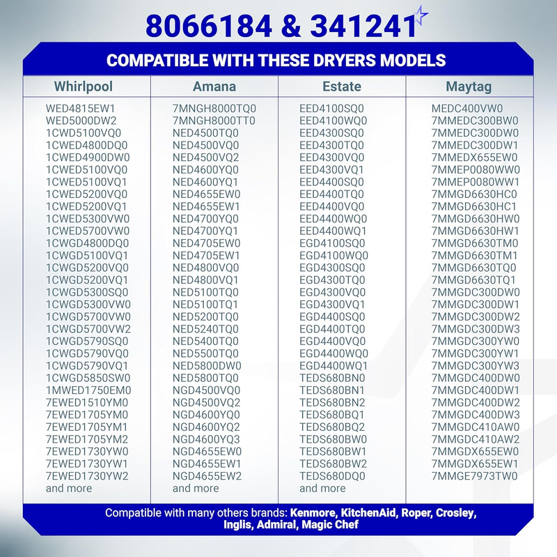 NOTE This is not a complete list of compatible models. If you're unsure about the compatibility, send us your dryer model number and we can help you confirm if it fits or not Whirlpool 1CWD5100VQ0 1CWED4800DQ0 1CWED4900DW0 1CWED5100VQ0 1CWED5100VQ1 1CWED5200VQ0 1CWGD5790VQ1 7MGGX9868JQ1 7MLGC9545PW0 7MLGQ8857JQ1 7MLGR8620PW0 1LE5700XKW0 1LE5920XKW0 1LG5701XKW0 1LG5921XKW0 2LG5701XKW0 3LE5700XKW0 3LE5710XKW0 3LE5710XMW0 3LE5710XMW1 3LE5710XMW2 3LG5701XKW0 3LG5701XPW0 GEN2000HQ1 GEN2000HZ1 GEQ8858HQ1 GEQ8858HZ1 GLE7900XKW0 Whirlpool LE5530XKW2 LE5530XMW2 LE5530XPW0 LE5530XSW0 LE5530XSW1 LE8650XKW0 7WEWED1705YM0 7WEWED1705YM1 7WEWED1705YM2 7WEWED1730YW0 7WEWED1730YW1 7WEWED1730YW2 7WEWED1510YM0 7WEWED1510YM1 7MLCG9545JQ0 7MLCG9545JQ1 7MLCG9545JQ4 7MLCG9545JQ5 7MLCG9545PW0 7MLCG9800PW0 7MLG8800JQ0 7MLG8800JQ1 7MLG8800JQ4 7MLG8800JQ5 7MLG9885FQ0 7MLG9885JT1 7MLG9885JT4 7MLG9885JT5 7MLG9885JT6 7MLG9885PQP0 Kenmore 11060012000 11060012001 11060012002 11060022010 11060022011 1106012510 1106012511 11060172000 11060172001 11060172002 11060182000 11060202990 11060212990 11060222510 11060222511 11060232000 11060232001 11060232002 11060522900 11060602990 11060612990 1106062110 Maytag 7MMEDC300BW0 7MMEDC300DW0 7MMEDC300DW1 7MMEDX655EW0 7MMEP0080WW0 7MMEP0080WW1 7MMGD6630TM1 MED5500FC0 MED5500FW0 MGD5500FC0 MGD5500FW0 7MMEDC300BW0 7MMEDC300EW0 7MMEDX655EW0 7MEP0080WW1 7MMGD6630TM0 7MMGD6630TM1 7MMGD6630TQ0 7MMGD6630TQ1 7MMGD300DW0 7MMGD300JW0 7MMGD300UW0 7MMGD300VW0 7MMGD300YW1 7MMGD300YW2 7MMGC400DW0 7MMGC400BW0 7MMGC400UW2 7MMGC410AW0 7MMGC410AW2 7MMGD410AW0 7MMGC410AW2 7MMGC400BW0 7MMG9873TW0 7MMG6474TW0 7MMG6474TW1 7MMG4010VW0 7MMG3070WQ0 7MMG4030WQ0 and 7MMG4070WQ0 Crosley CED1235EW0 CED1265BW1 CED1265XQ0 CED1265XQ1 CED137HXQ0 CED137HXW0 CED137SBW0 CED137SBW1 CED137SDW0 CED147HXW0 CED147SBW0 CED147SDW0 CED147SDW1 CED147SDW2 CEDS1043VQ0 CED1043VQ1 CEDS563MQ0 CEDS563MQ1 CEDS563R1 CEDS563RQ1 CEDS563RQ2 CEDS663SQ0 CEDS663SQ0 CEDS663SQ0 CEDS663SQ0 CEDS832VQ0 CEDS832VQ1 CEDX774JQ1 CEDX774JQ1 CEDX774MQ1 CEDX774MQ1 CEDX463SQ0 CEDX463SQ1