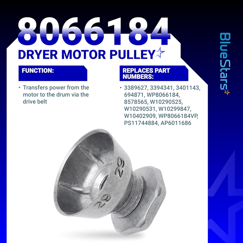 PERFECT MATCH: 8066184 Dryer Motor Pulley replaces WP8066184, PS11744884, AP6011686, 3389627, 3394341, 3401143, 694871, 8066184, 8578565, W10290525, W10290531, W10299847, W10402909, WP8066184VP