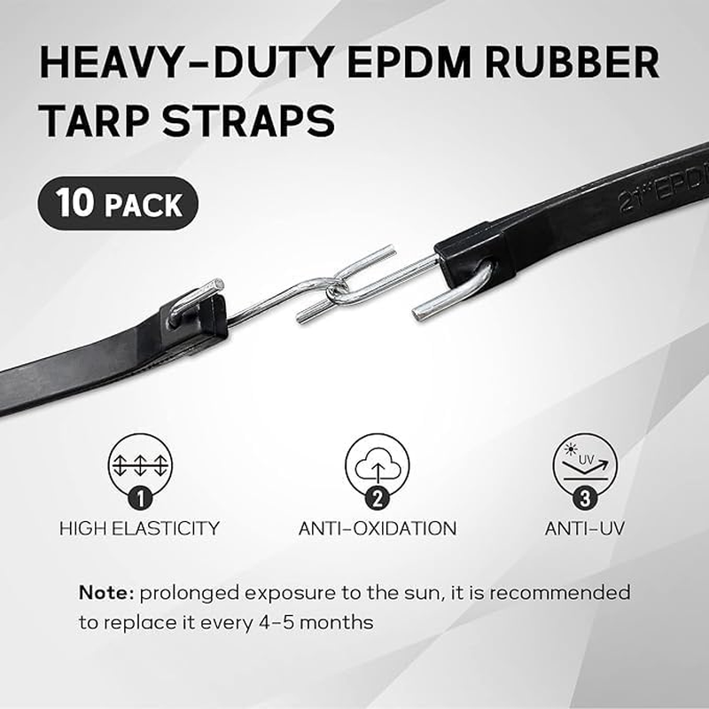 Rubber tarp strap is made of high quality EPDM material, which will not wear or break in daily use and different weather conditions, and has high elasticity, oxidation resistance, UV protection, super long life