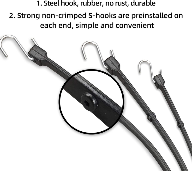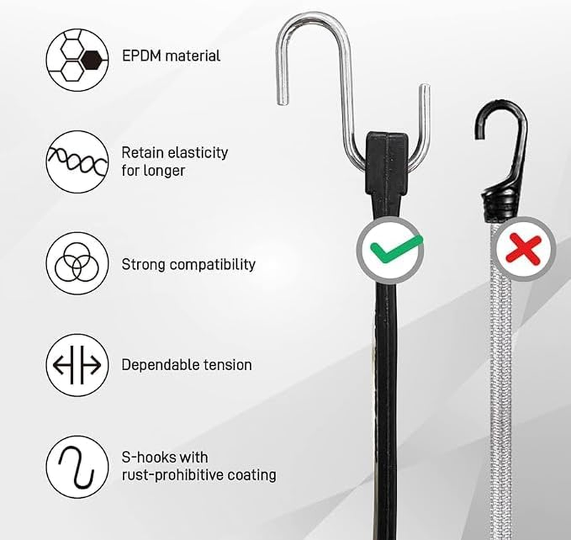 Preferred EPDM Material: Bungee cords with S hooks are made from 100% premium EPDM rubber. Our heavy-duty bungee cords are 30% thicker than other similar products, offering better elasticity, durability and safety. It will not fray or break in everyday use and in all weather conditions and is oxidation resistant, UV protected and has an extra long life. Can be used both outdoors and indoors