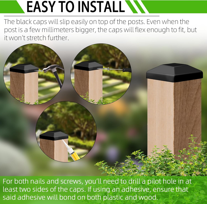 EASY TO INSTALL AND SECURE FENCE POST CAPS - The black caps will slip easily on top of the posts. Even when the post is a few millimeters bigger, the caps will flex enough to fit, but it won?t stretch further. There are 3 options in securing the caps to the posts: nails, screws, and adhesive. For both nails and screws, you?ll need to drill a pilot hole in at least two sides of the caps. If using an adhesive, ensure that said adhesive will bond on both plastic and wood.