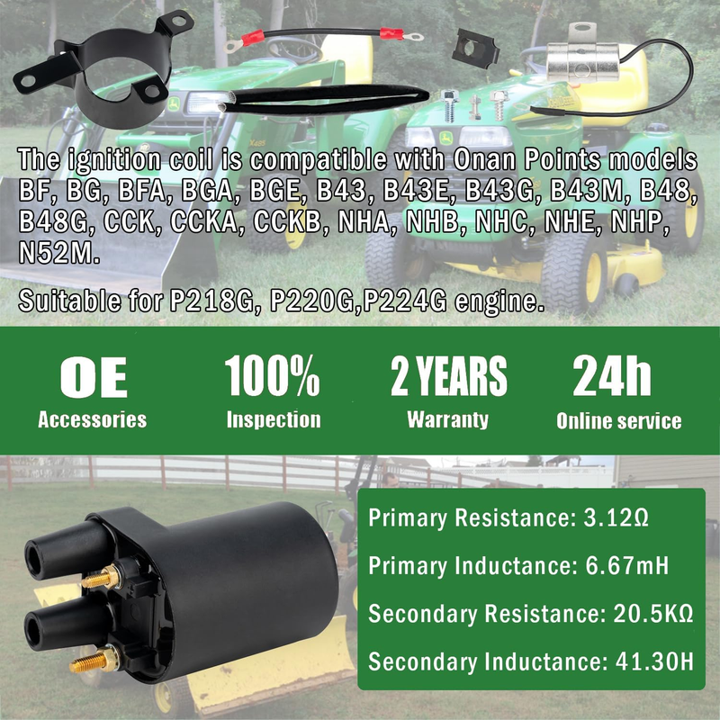 ?Compatible? The ignition coil is compatible with Onan Points models BF, BG, BFA, BGA, BGE, B43, B43E, B43G, B43M, B48, B48G, CCK, CCKA, CCKB, NHA, NHB, NHC, NHE, NHP, N52M. Suitable for P218G engine, P220G engine, P224G engine.