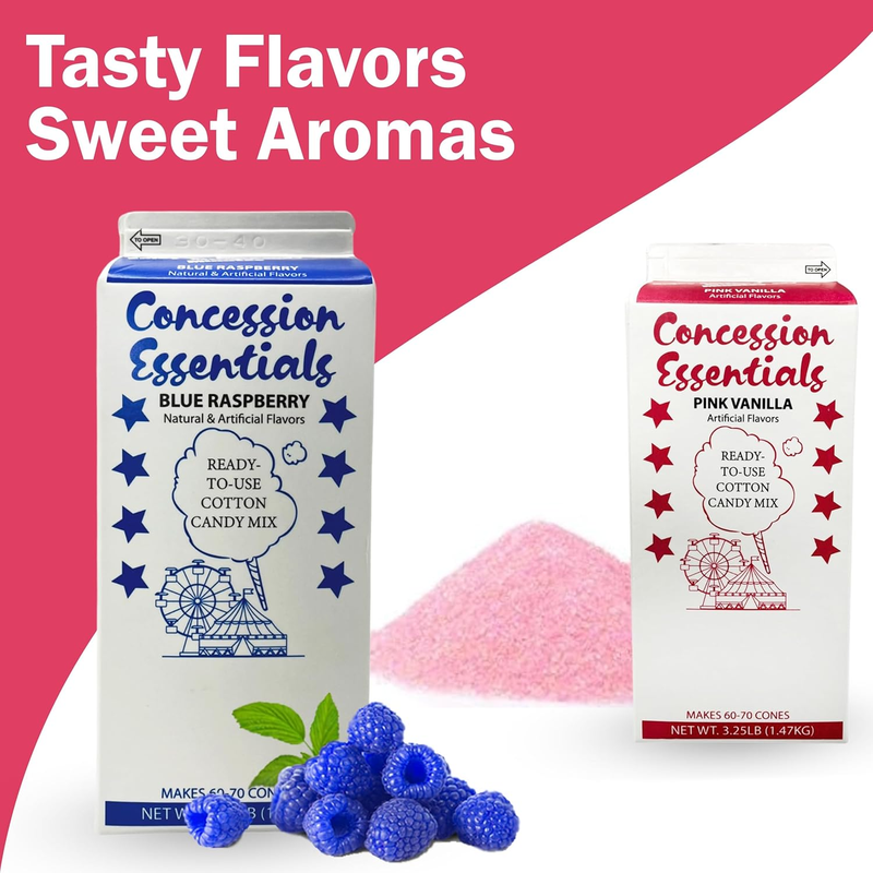 1 carton each of Blue Raspberry and Pink Vanilla cotton candy floss sugar. Great for carnivals, parties , and charity events. Each carton weighs 3. 25lbs and makes approximately 60 to 70 cotton candy cones.