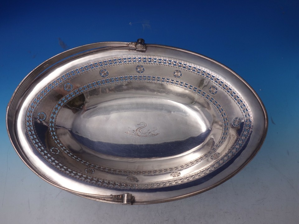 English Georgian Silverplate Basket with Handle Pierced Border Swans (#5839)