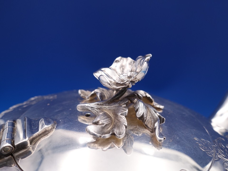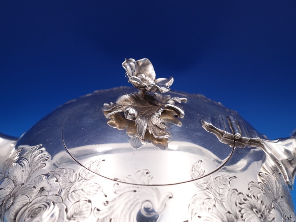 Lovely Elkington English Victorian sterling silver tea pot, made in Birmingham circa 1858. This gorgeous piece features a 3-D flower finial, chased roses, flowers, and scrollwork.