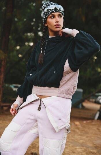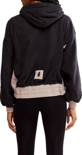 Brand new with tags Free People Snow Day hoodie jacket in black with lavender quilted sides. Drawstring hood. Sz Small. $128 retail
