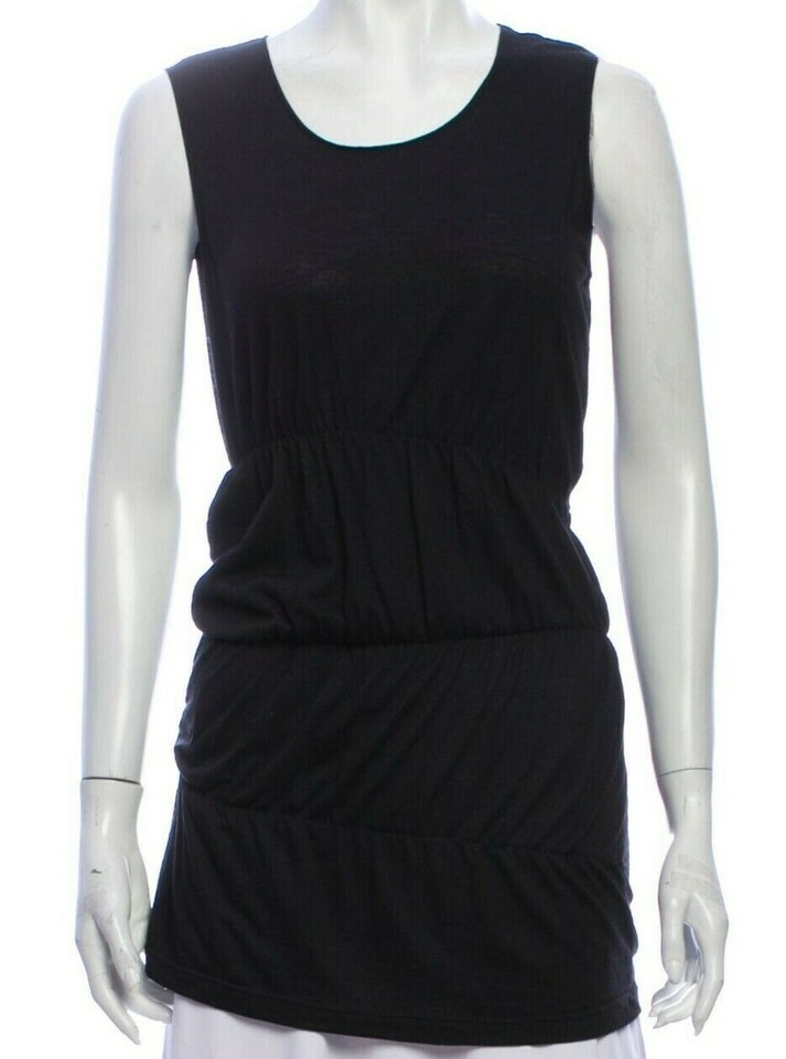 This is a great Helmut Lang tunic tank. Great piece from the late 1990's/early 2000s when Helmut was still the designer. Black silk/wool blend long crewneck tank with elastic ruching in circles around the body.