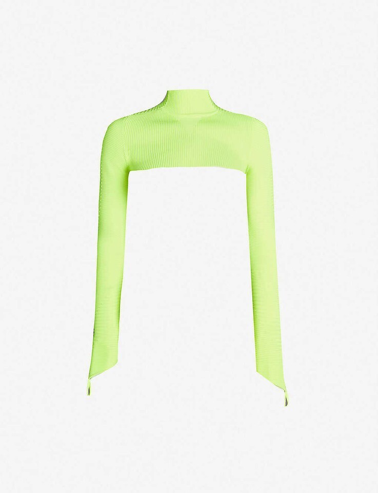This is a great Adam Selman Sport shrug. The ribbed knit sweater-like material top (100% nylon) in Neon Yellow with high neck and finger loops. Brand new with tags. $225 retail. This is THE KNIT SHRUG AS SHOWN IN SECOND PHOTO. BRA IS NOT ATTACHED OR INCLUDED