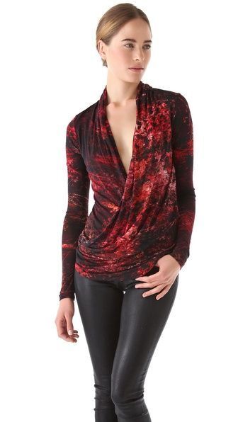 You are bidding on a great Helmut Lang top. The overlap drape top in Midnight floral red print. Lightweight Wool blend