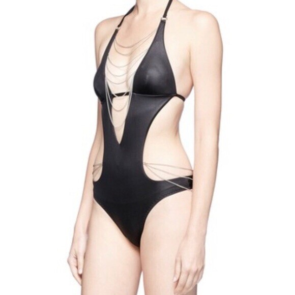 This is a great brand new with tags Agent Provocateur swimsuit. Tonya black shiny swimsuit with removable silver chain details.