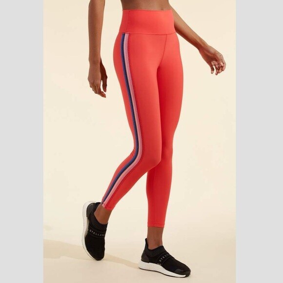 This is a great pair of Spiritual Gangster yoga/workout leggings. The Rainbow legging in Red (this is what the tag says but it's more like an orangey red/coral) with rainbow ribbon panel down the sides in metallic sparkly fabric. Size S