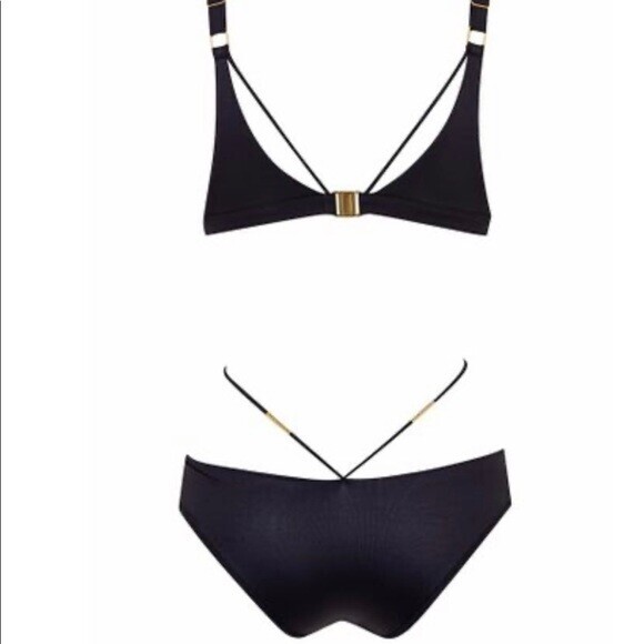This is a great brand new with tags Agent Provocateur swimsuit. Harley black shiny swimsuit with gold bar details. Super strappy monokini look.
