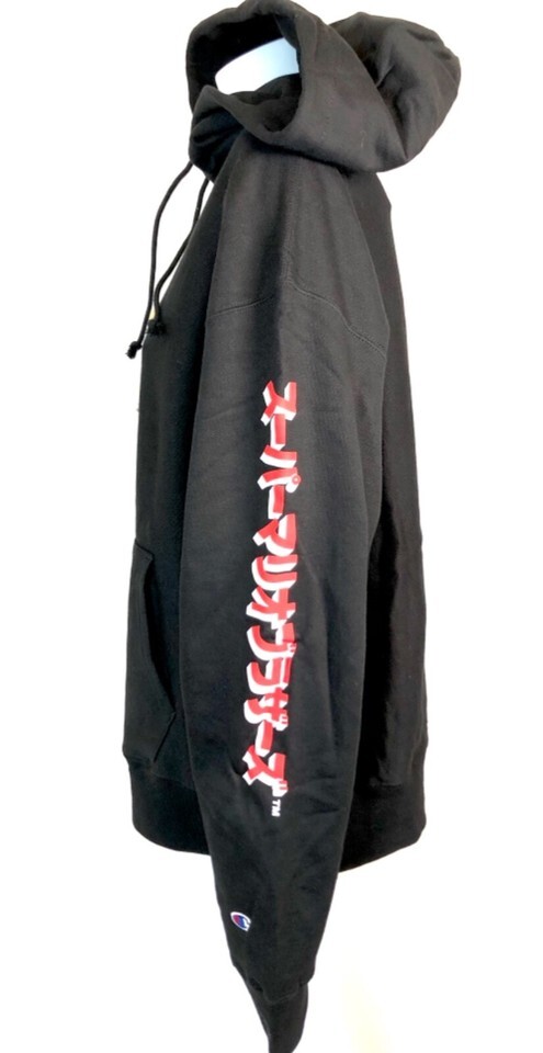 This is a great brand new with tags, guaranteed authentic, limited edition Champion x Super Mario bros Nintendo hoodie. Chenille Super Mario Power graphic on chest and Kanji symbols down sleeve. Sold by seller with 22 year selling history.