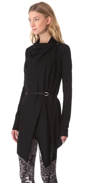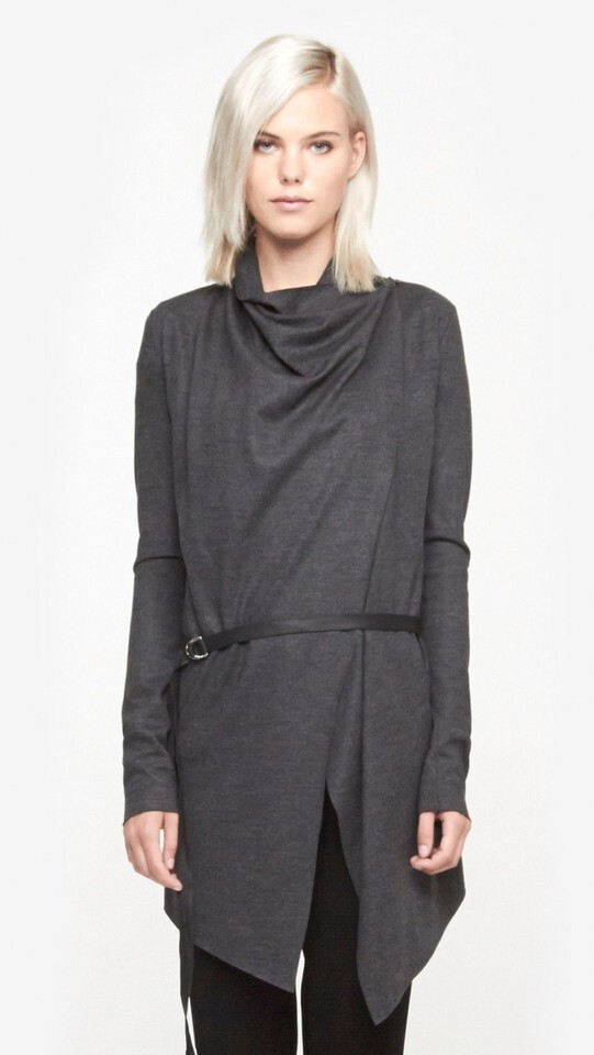 This is a great Helmut Lang jacket/sweater-cardigan. The Sonar wool Shawl Collar drapey long cardigan jacket in CHARCOAL GRAY (Photos showing black above are
