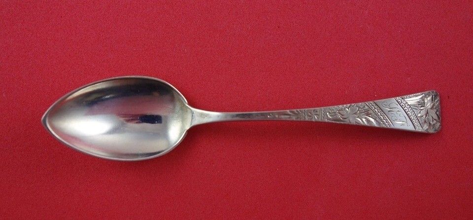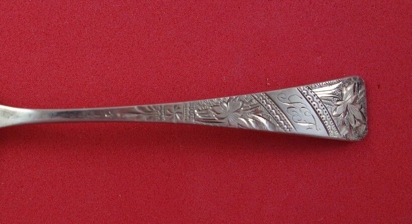 Coin silver Demitasse Spoon Bright-Cut, 4 1/4". It is monogrammed (see photos) and is in good estate condition as shown in the photographs.