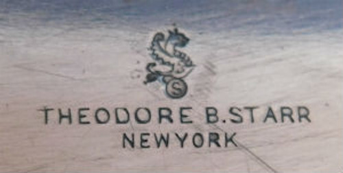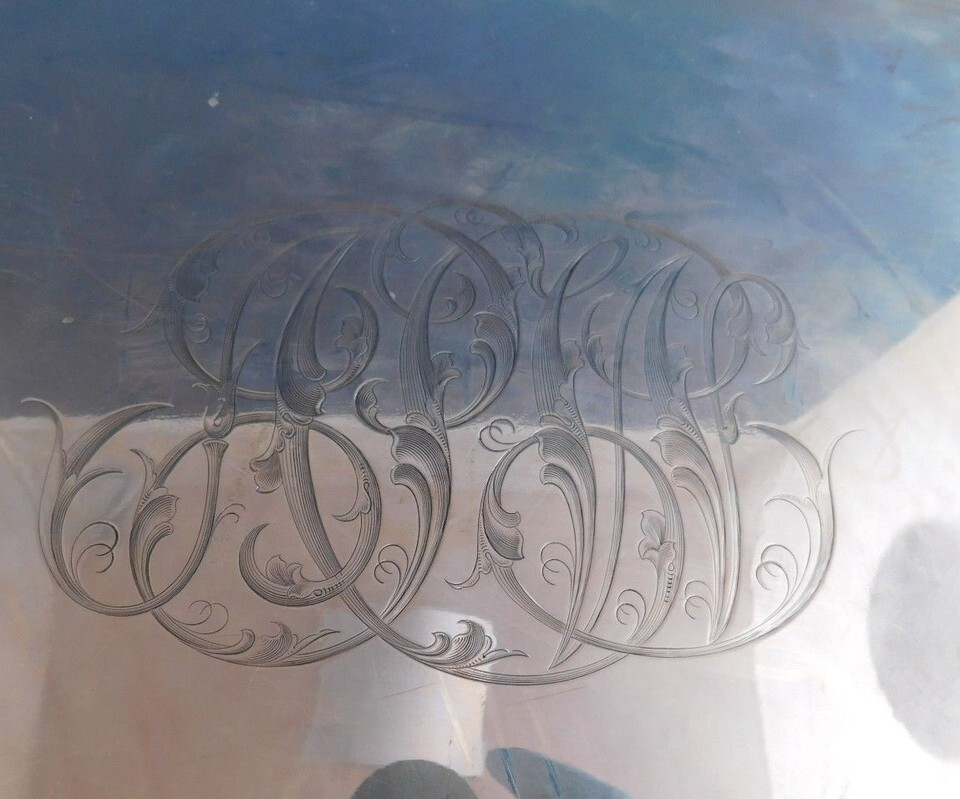 Stunning sterling silver Theodore Starr tea tray. This tray weighs 145.75 ozt., and measures 30" x 19 1/2" x 2". It features a beautiful border with an elegant monogram in the center of the tray and an inscription on the bottom (see photos). The tray is marked Theodore B. Starr New York. It is in excellent condition. Impressive!