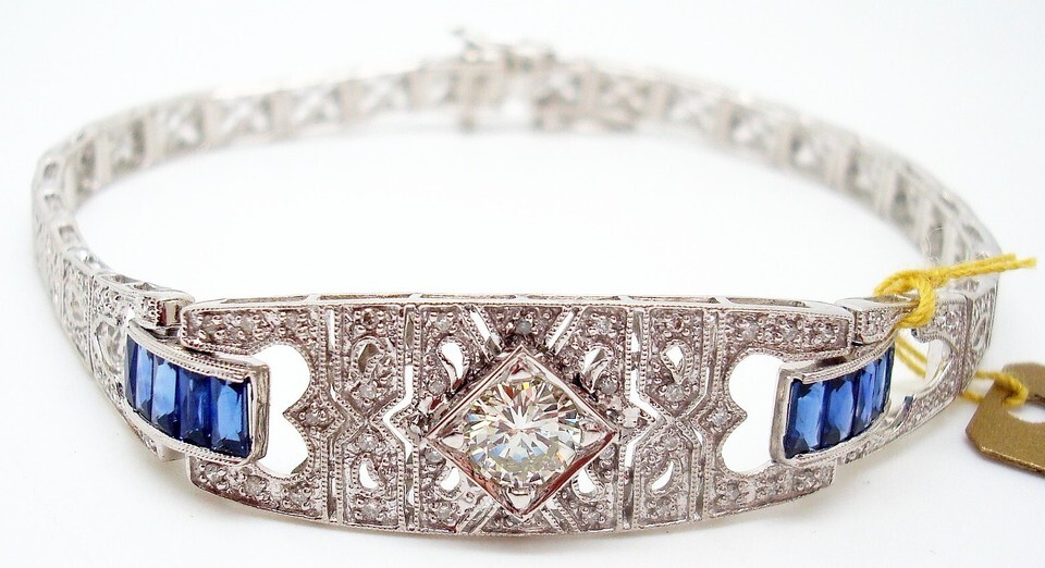 14k white gold diamond and sapphire filigree style bracelet. The bracelet features a .63 ct round brilliant cut diamond which measures approx 6mm. The diamond is accented by rectangular specialty cut genuine blue sapphires weighing 1/2 carat total and measuring approx 4mm x 2mm. There is an additional 1 carat total weight of small round diamonds measuring about 1mm each. The diamonds are SI-2 clarity and I-J color.