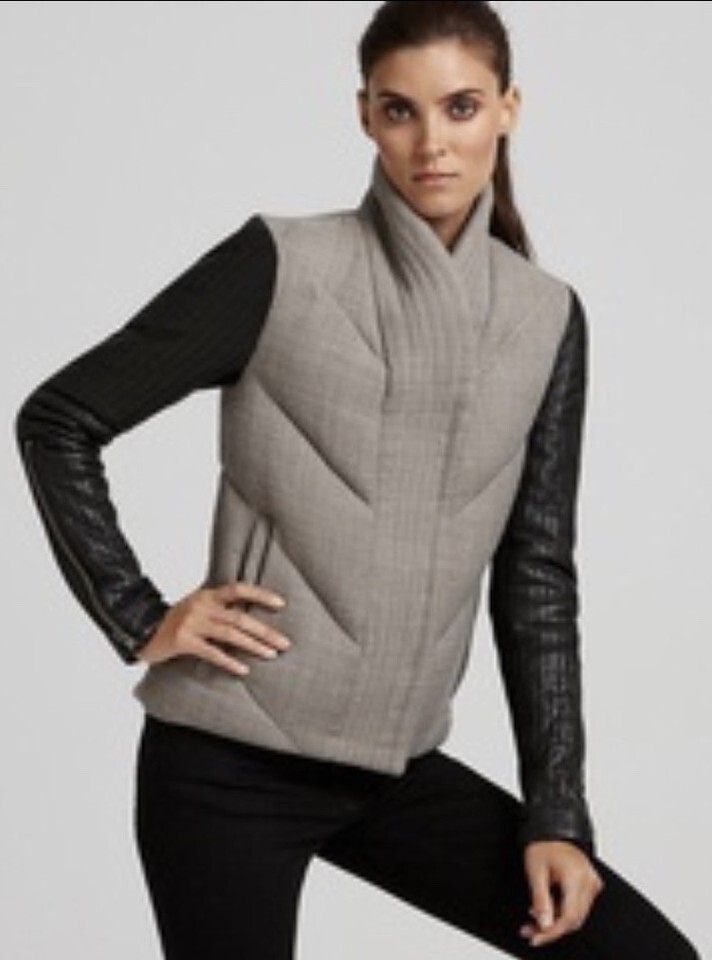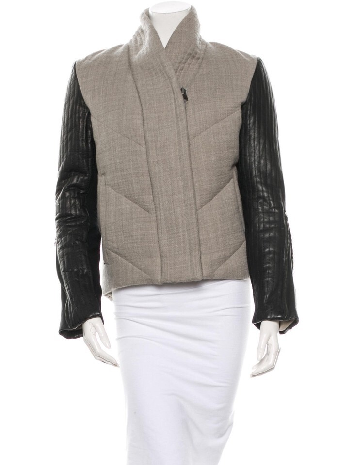 This is a great Helmut Lang leather sleeve quilted puffer jacket in gray with black leather sleeves. The Strata jacket features 100% lamb leather sleeves and wool puffer body with quilted pattern. Double zipper detail.