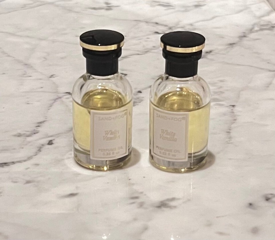 Brand new set of TWO mini size dauber top bottles of Sand + Fog White Vanilla perfume oil. .25oz each for a total of .5oz