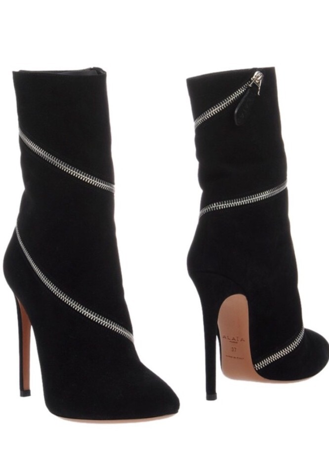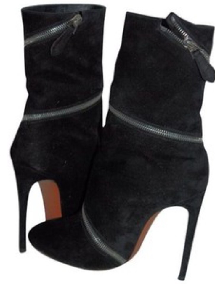 You are bidding on a great pair of Azzedine Alaia boots. Black suede ankle boots with stiletto heel and spiral wrapping silver zipper. Stunning high end pair.