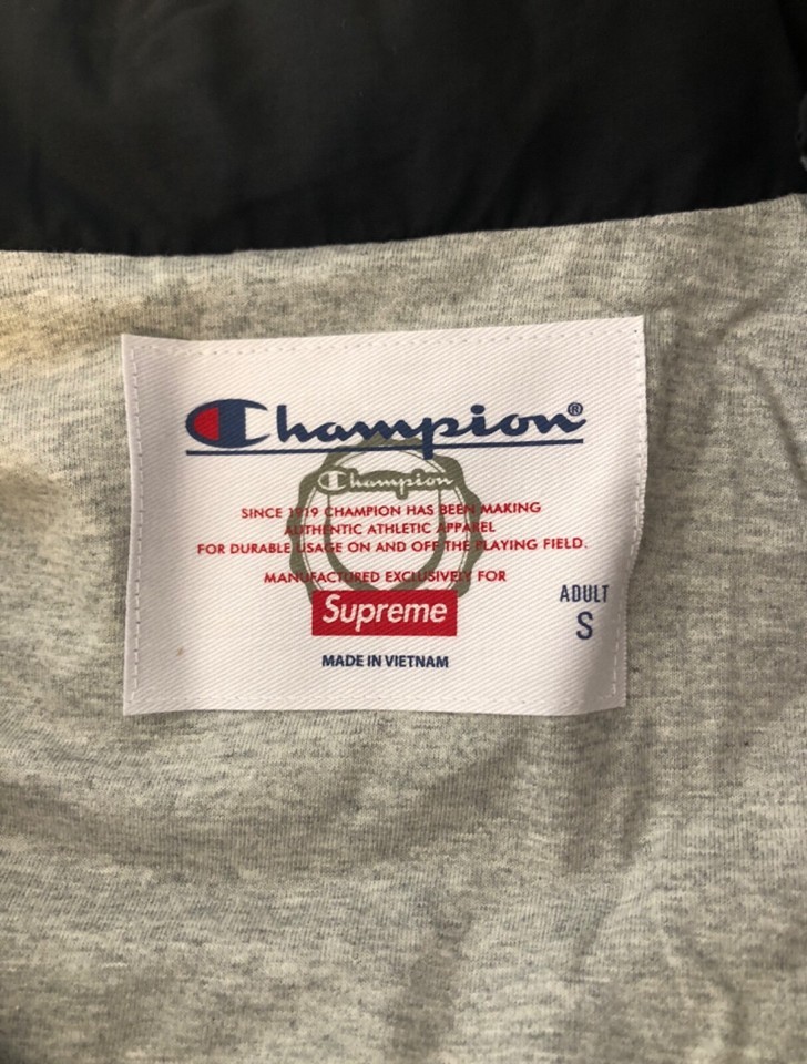 This is a great Champion x Supreme collaboration track jacket. Full zip jacket with front pockets in black with huge champion logo across arm and back and gray inner lining. Hood folds up into collar to be worn either way. Size S