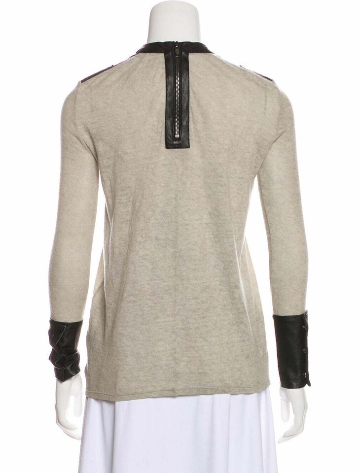This is a great sweater by Helmut Lang. The Angora Cozy sweater in Mute (grayish tan) with great black leather trimmed snap cuffs and neckline trim and back zipper. 50% wool/30% viscose/20% angora. 100% lamb leather trim.