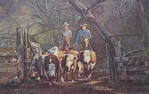 Product description: Last of the Herd is a signed and numbered limited edition print by Tim Cox. It depicts a couple of cowboys herding the last of their Hereford cows into the corral. The image size is 12" x 18". Overall size is 16.25" x 22". It was published by Texas Art Press in 1979 in a limited edition of 2,250.