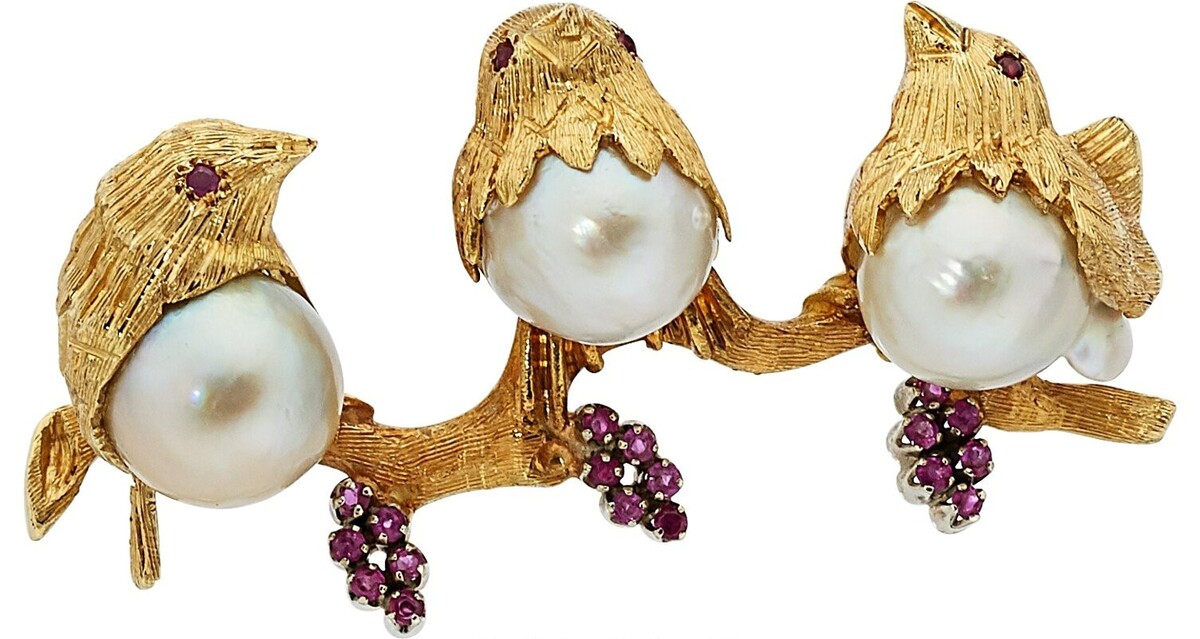 Verfügt über drei Vogel mit runden kultivierten Perlenkorpern