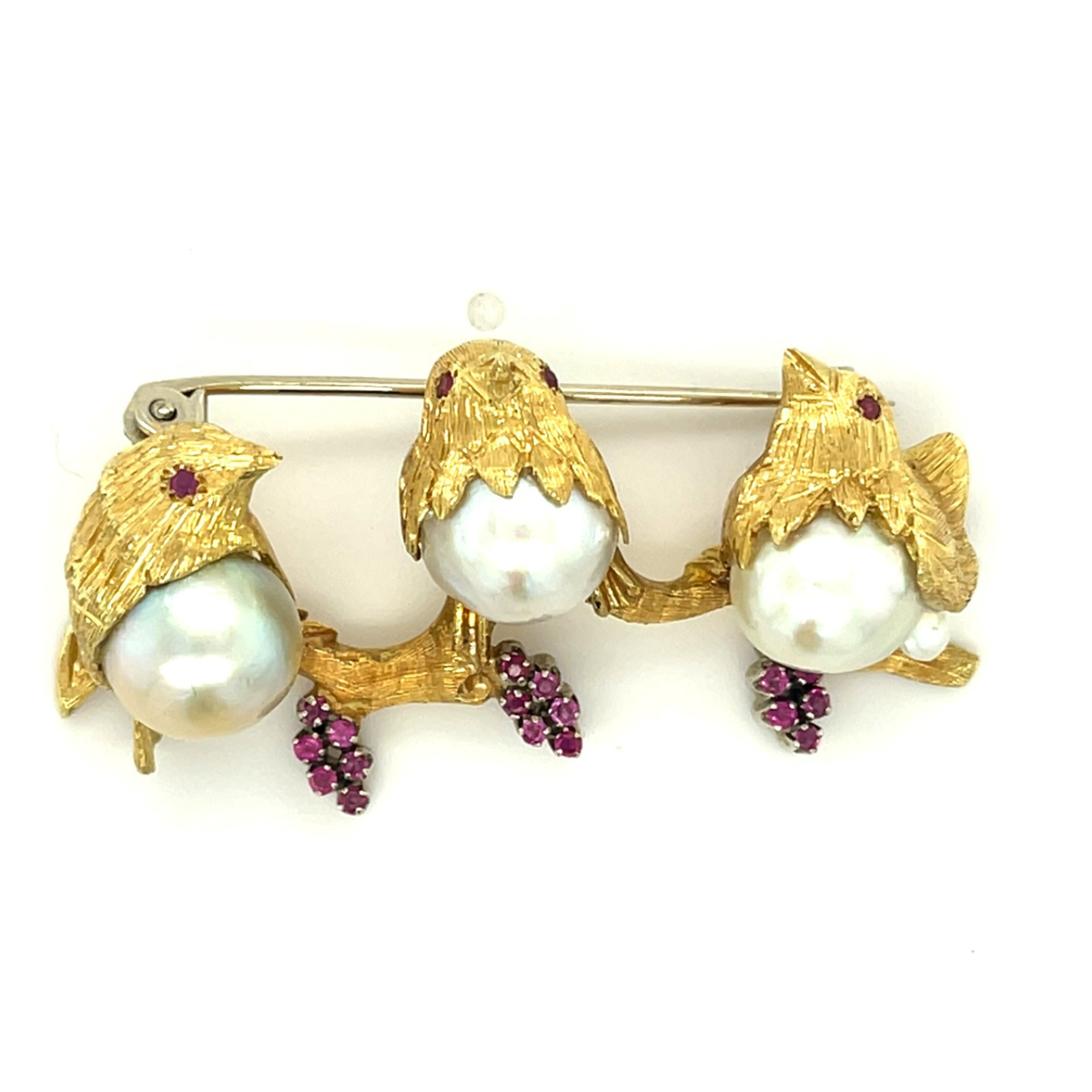 18k Gelbgold Zuchtperle Drei Vogel Sitzender Brosche Mit Rubine