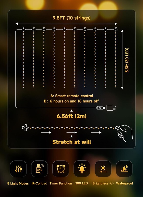 300 LED Curtain String Lights, 9.8 FT Hanging Fairy Lights with Remote, 8 Modes,