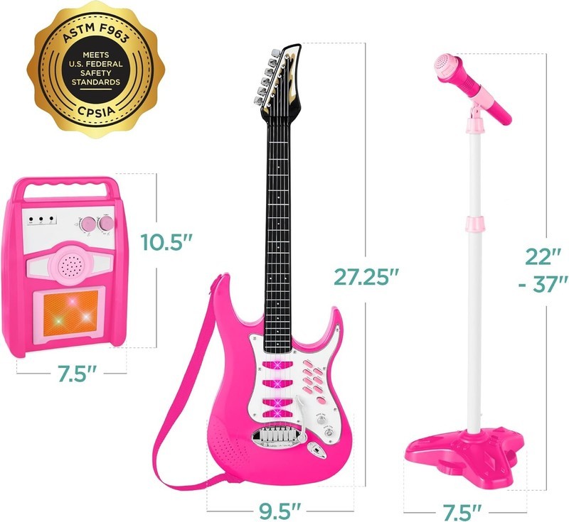 CHILD-FRIENDLY DESIGN: Your child will enjoy playtime thanks to a durable design that features beveled edges to help reduce the chance of injury; GUITAR DIMENSIONS: 9.5"(L) x 1"(W) x 27.25"(H)