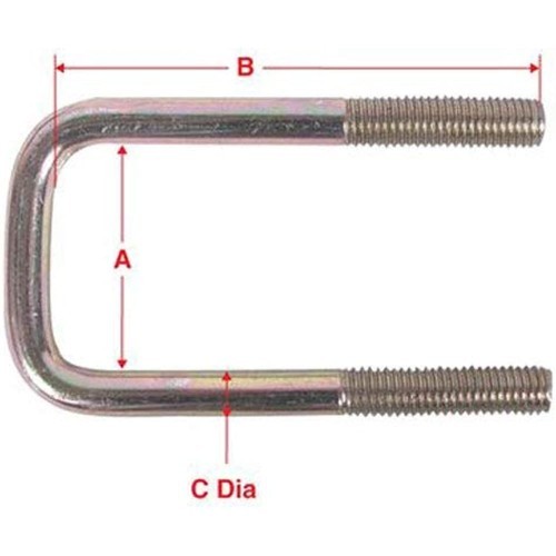 Axle U-bolt kit, for 7/16 inch diameter rod with rolled threads for maximum strength, used on 3 inch diameter axles, 4 inch long legs, zinc plated, includes 2 U-bolts 4 nuts.
