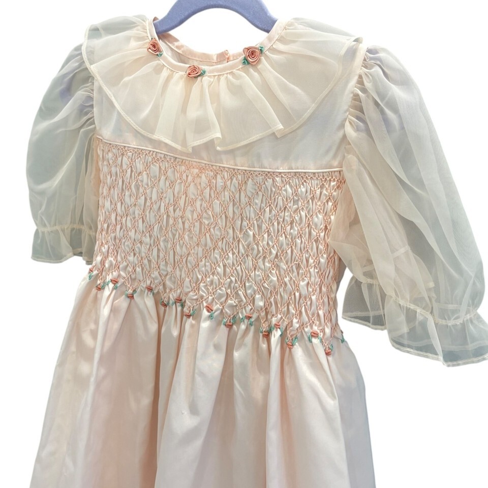 This elegant dress features delicate smocking, sheer puff sleeves, and floral details, creating a refined and timeless look for special gatherings.