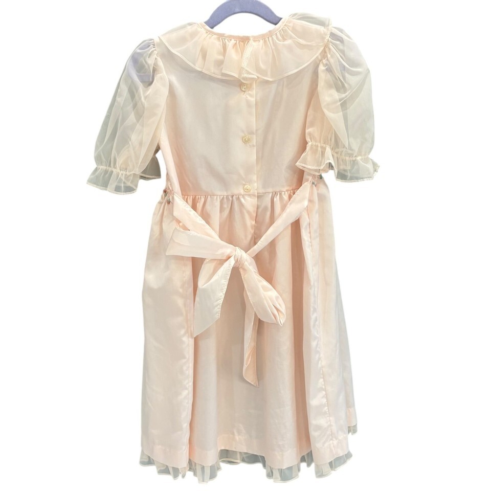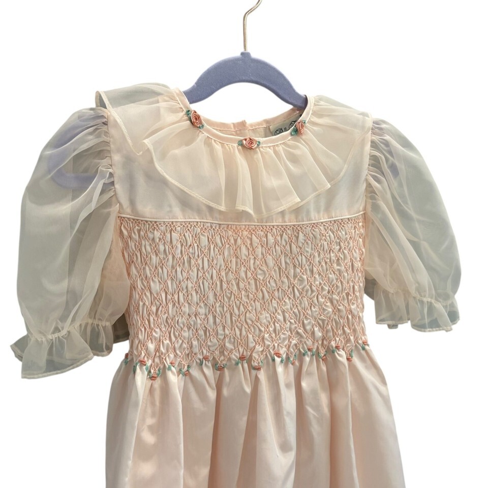 Polly Flinders Pink Smocked Dress With Sheer Puff Sleeves & Floral Accents 6X