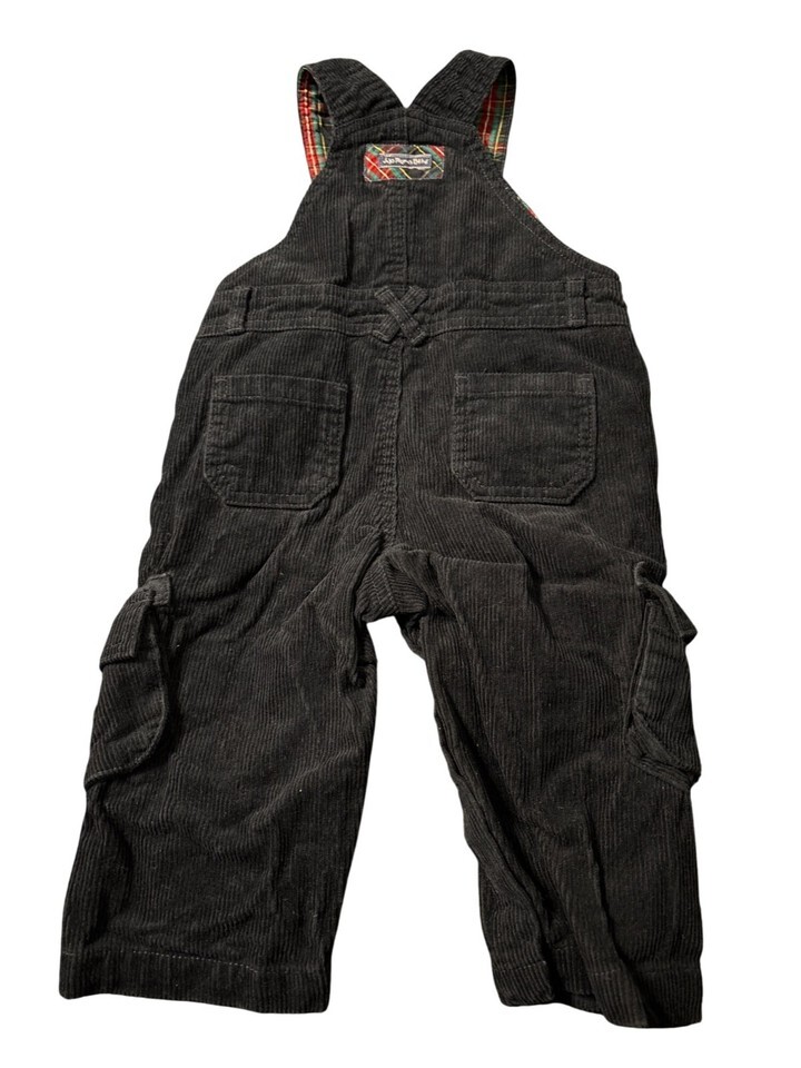 Soft corduroy overalls with adjustable straps and plaid lining. Features multiple pockets for utility and style, ideal for versatile baby wear.