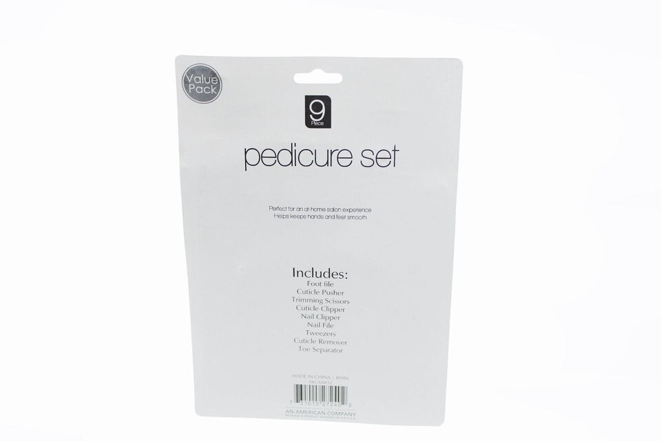 The 9-Piece Manicure and Pedicure bundle comes with everything needed to create an at-home salon experience. Set includes Foot File, Cuticle Pusher, Trimming Scissors, Cuticle Clipper, Nail Clipper, Nail File, Tweezers, Cuticle Remover, and Toe Separator. This value pack is all you'll need to keep hands and feet smooth to the touch. The set comes packaged on a hanging blister card measuring approximately 7.5 x 11.