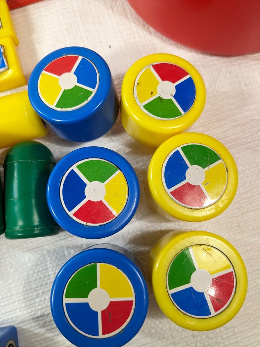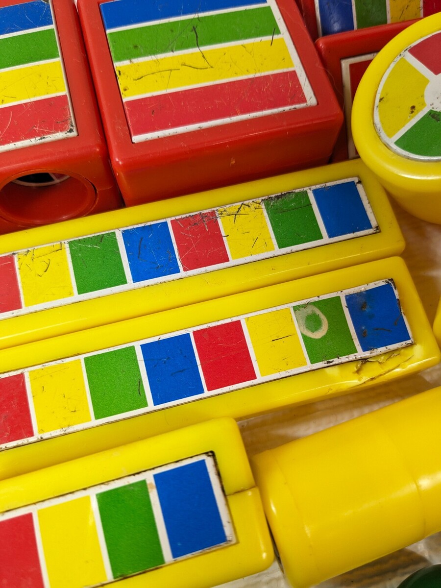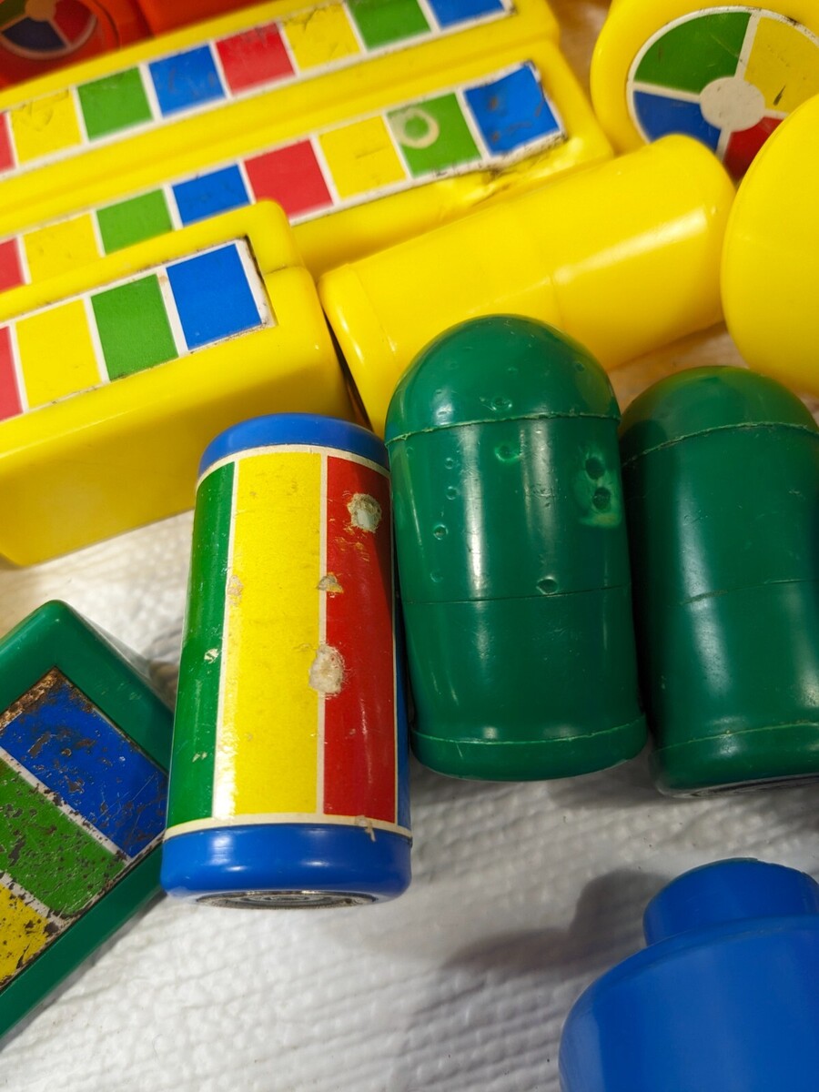 Lots of wear/scratches/some rust as shown. Some pieces are dented/have marks/chews as shown. See all pics. Comes with red bucket/pail.