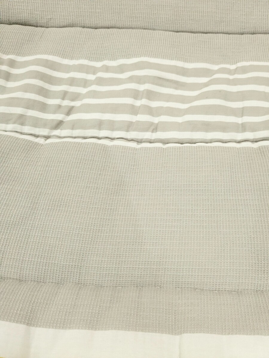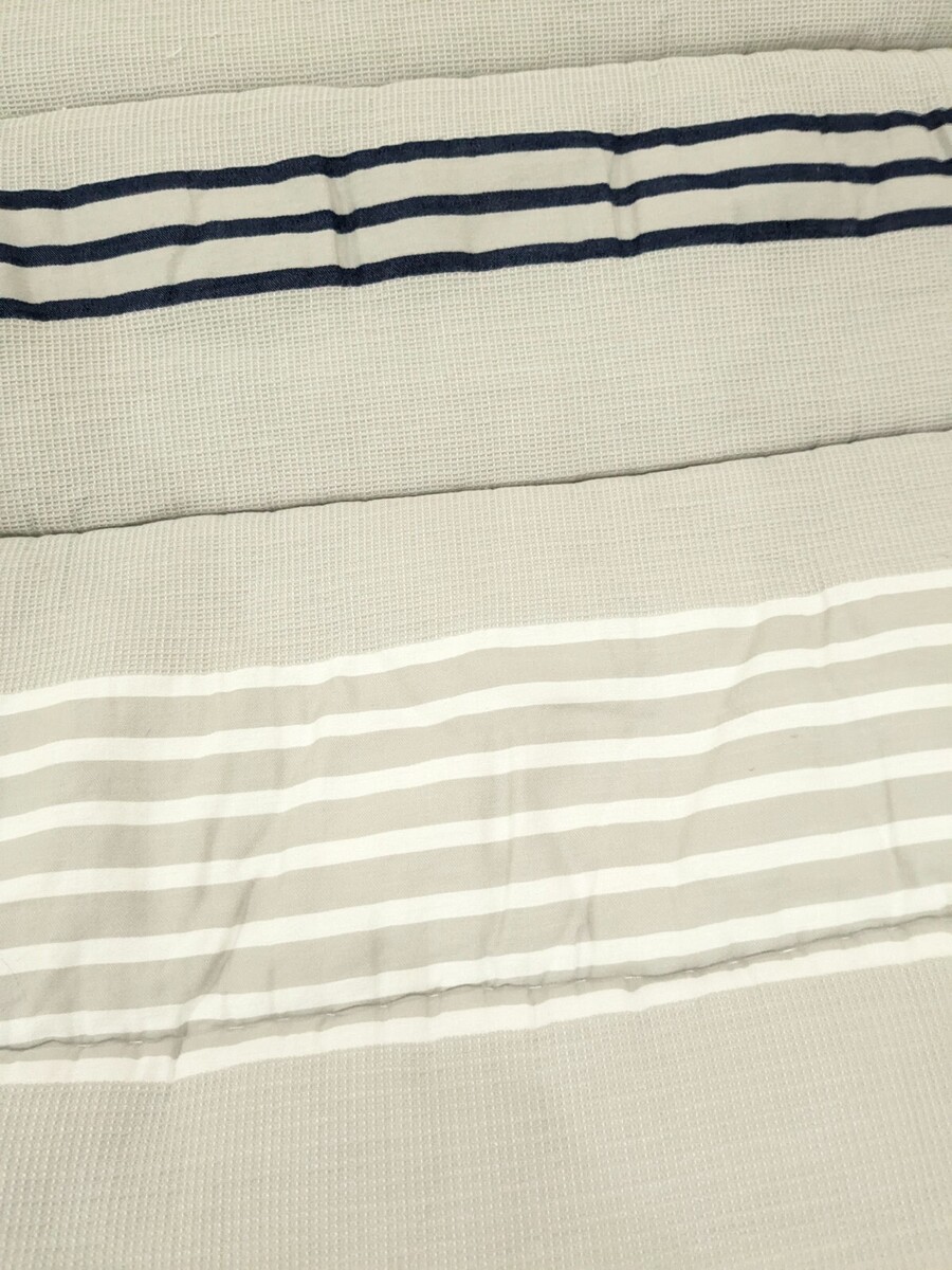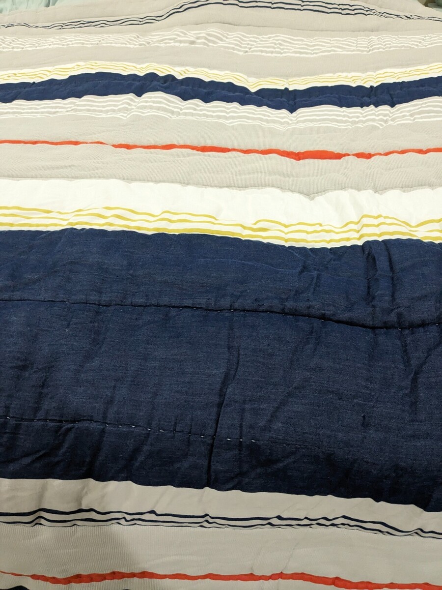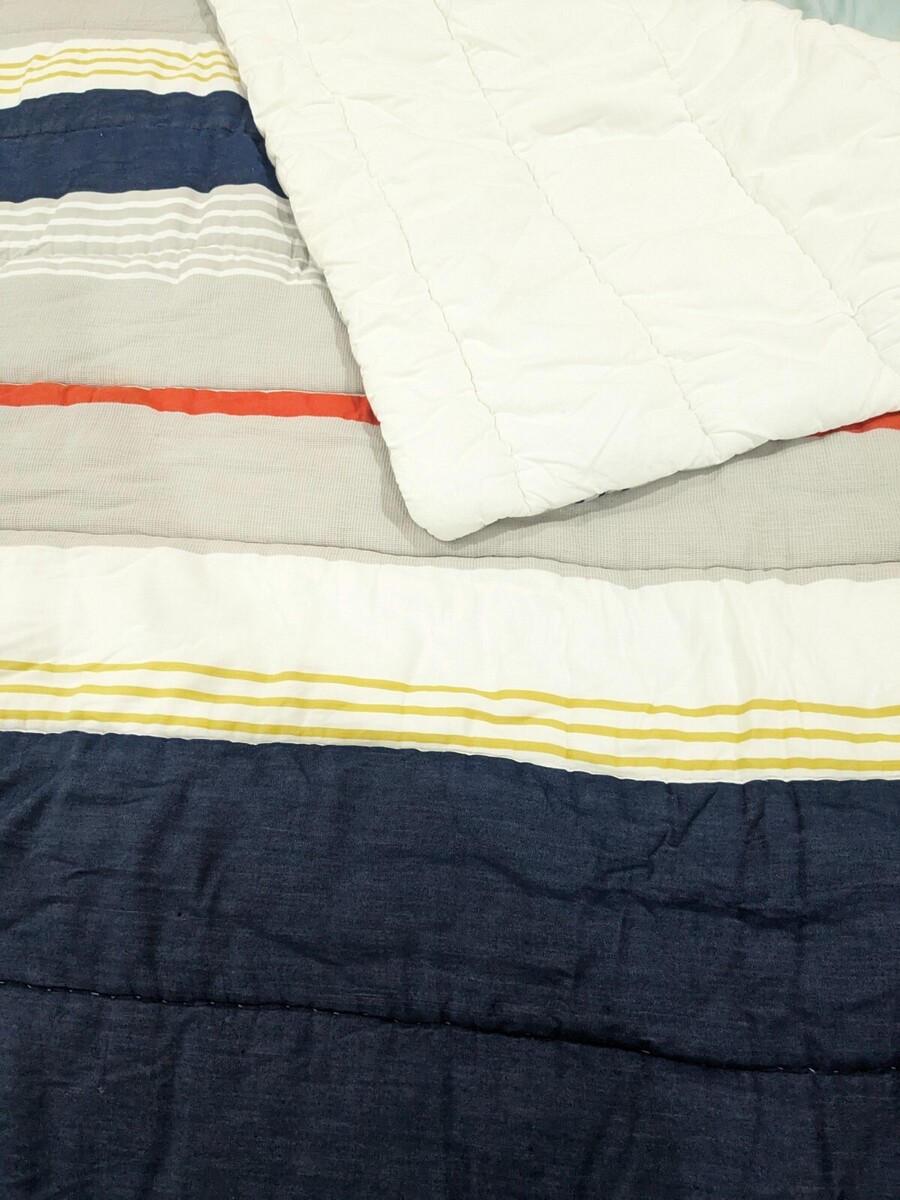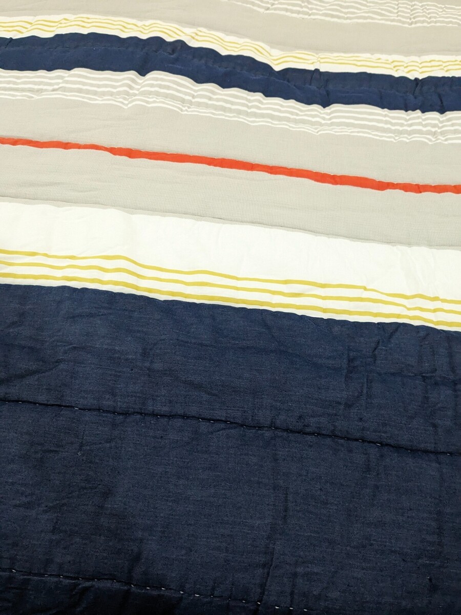 Denim, white, yellow orange and tan (textured) stripes. Light mark/stain on corner as shown that isn't very noticeable. Comforter been washed, but has a perfumed smell from the previous owner. Overall very good condition.