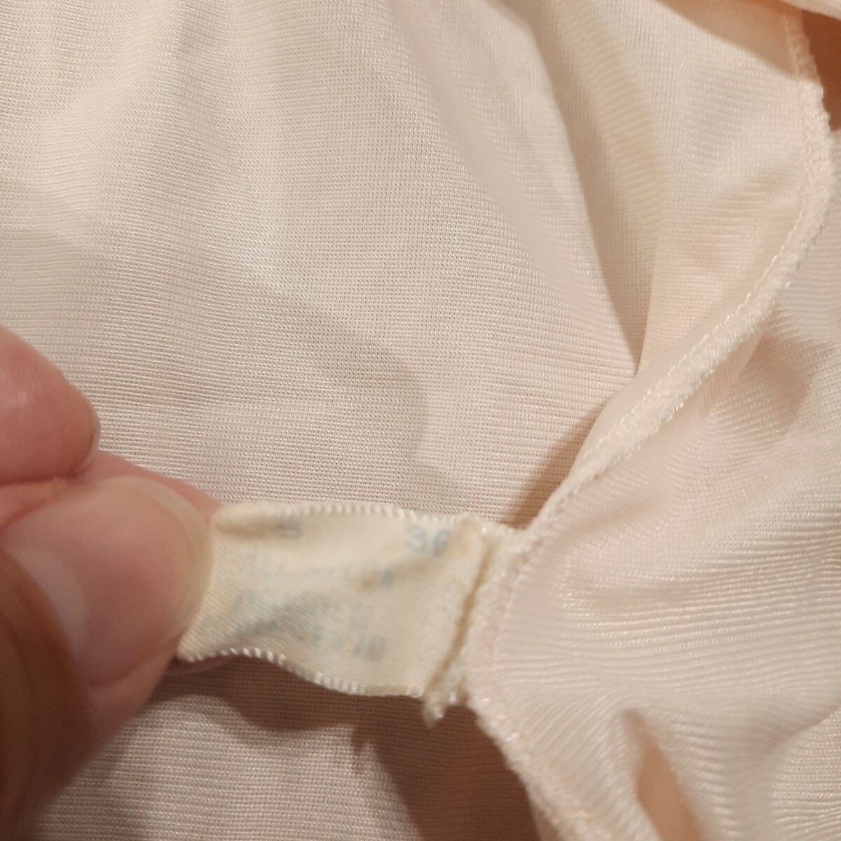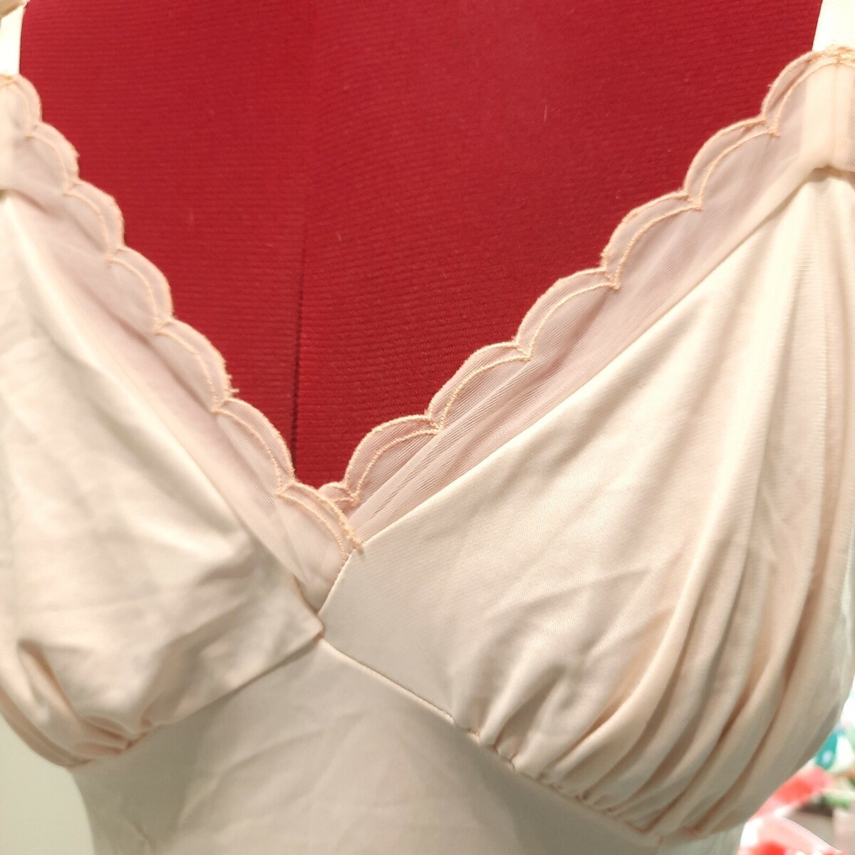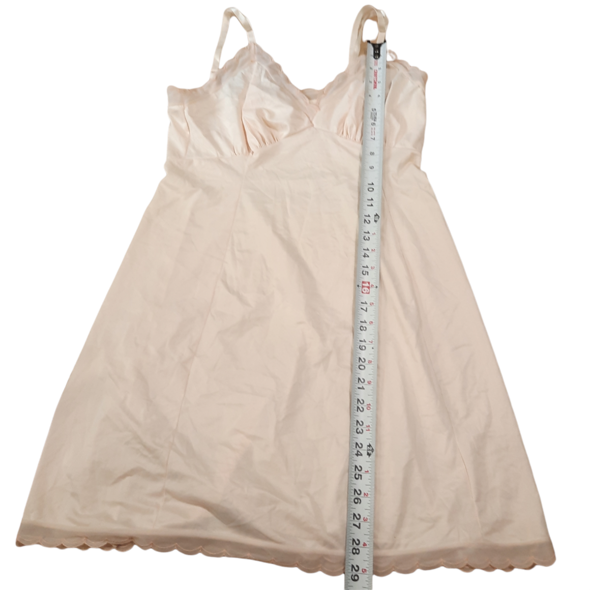 Light pink/blush/peachy color with scalloped edge trim. Small repaired flaw as shown otherwise very good condition. Adjustable straps. 100% nylon. Soft and silky.
