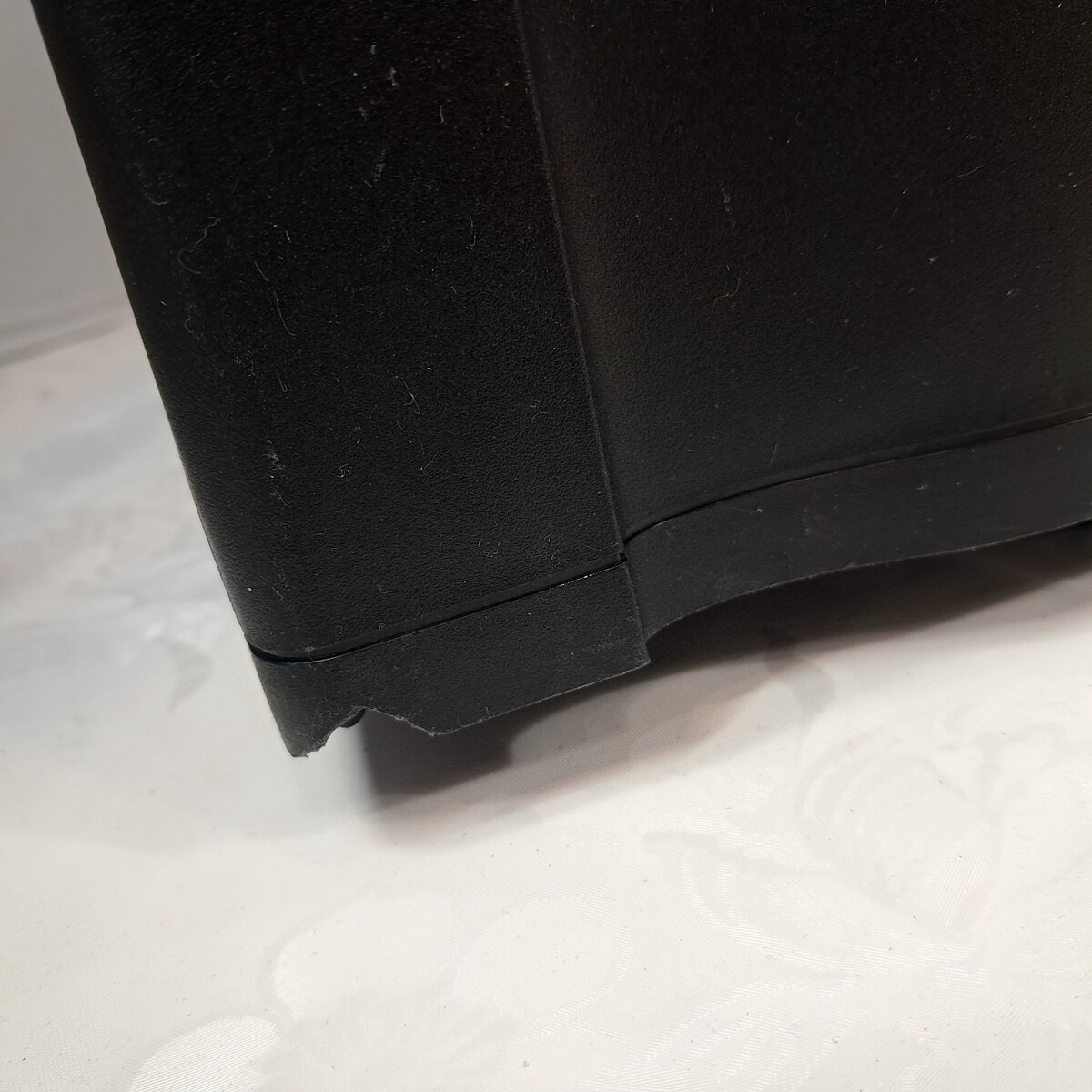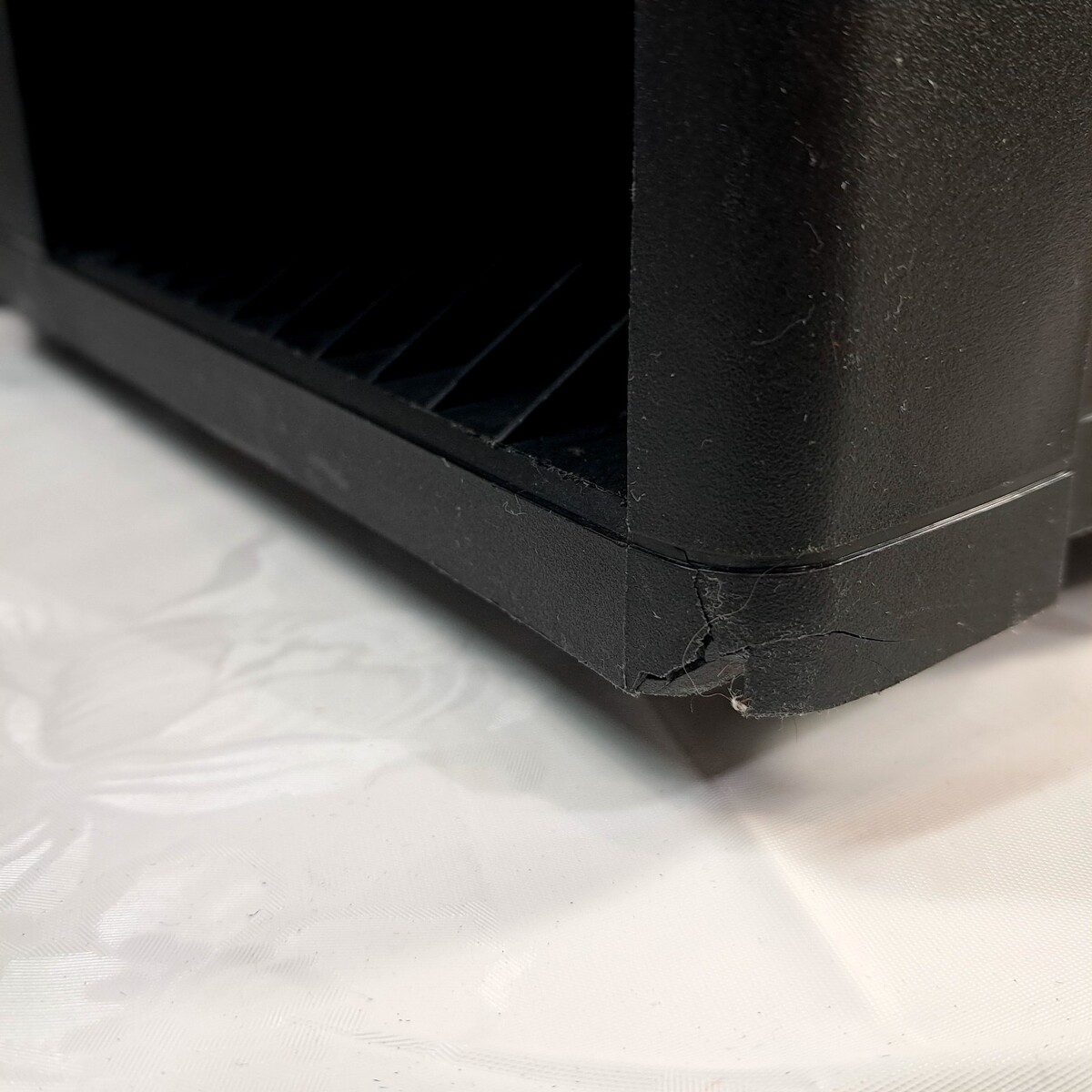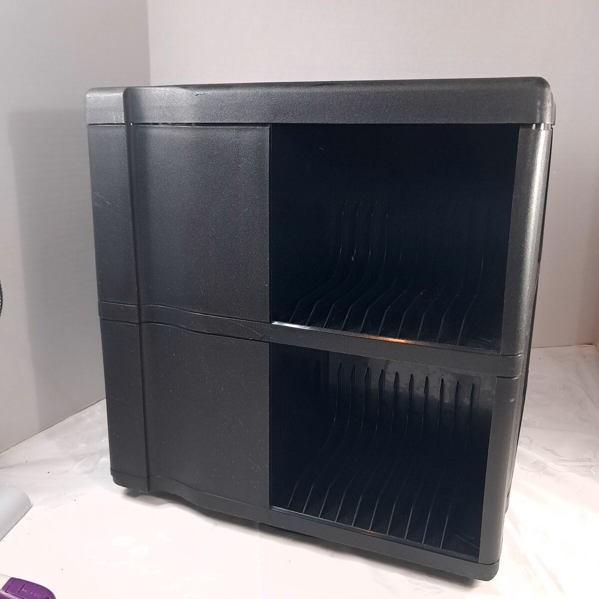 Black storage tower/cube. Each section holds 11-12 cds(the last slot in each section can hold a double CD, or 2 singles/so 12 if doubled up in the last slot) Holds 96 CDs total. Some cracking at the bottom of the corners as shown, some scuffs/scratches/see pics.