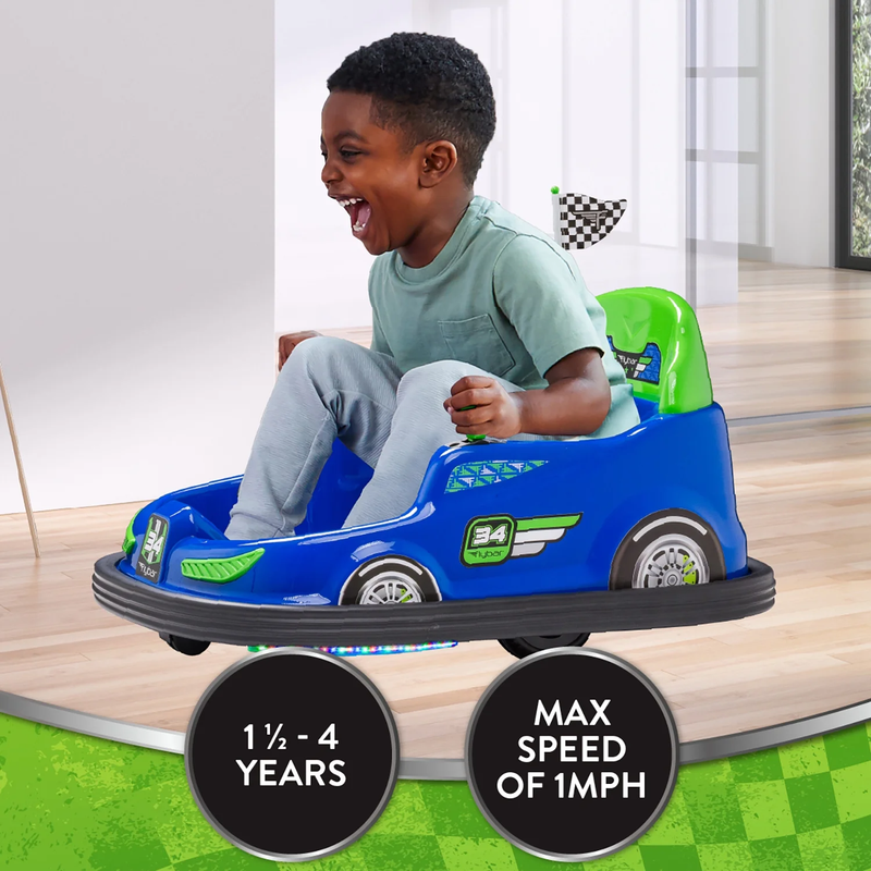 Turn playtime into an exciting adventure with the Flybar 6V Blue Bumper Car. Perfect for toddlers and young kids ages 1.5 to 4 years, this battery-powered ride-on features colorful LED lights for extra fun and visibility. Kids can enjoy 360 spins with easy-to-use joysticks, while soft foam bumpers protect walls and furniture during play. The included safety belt keeps riders secure, and the rechargeable 6V battery ensures hours of entertainment. With a gentle 1 mph max speed, it?s a safe and thrilling ride for beginners. Ideal for indoor or outdoor use, the Flybar bumper car delivers smiles, giggles, and unforgettable memories.