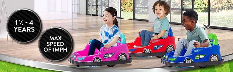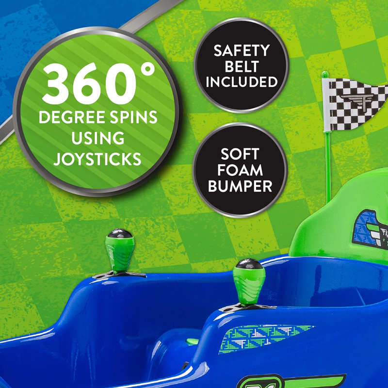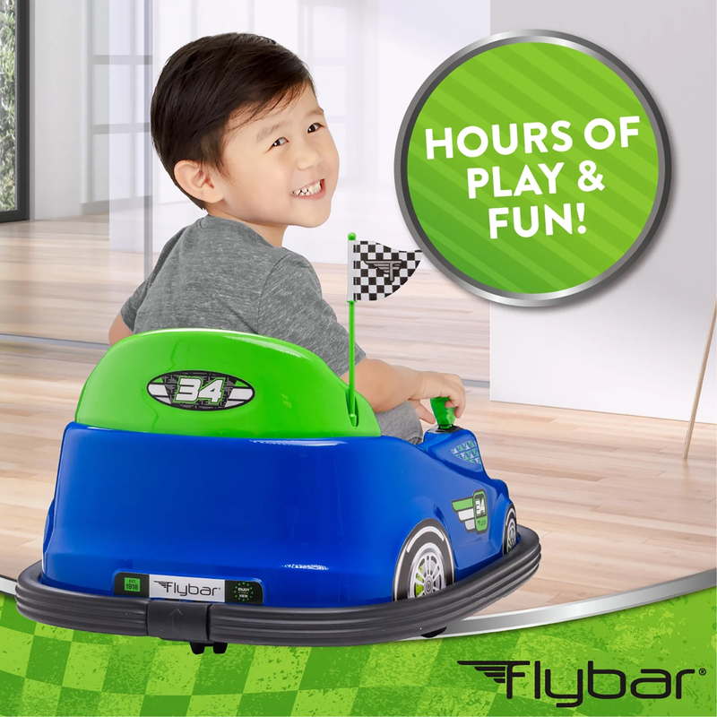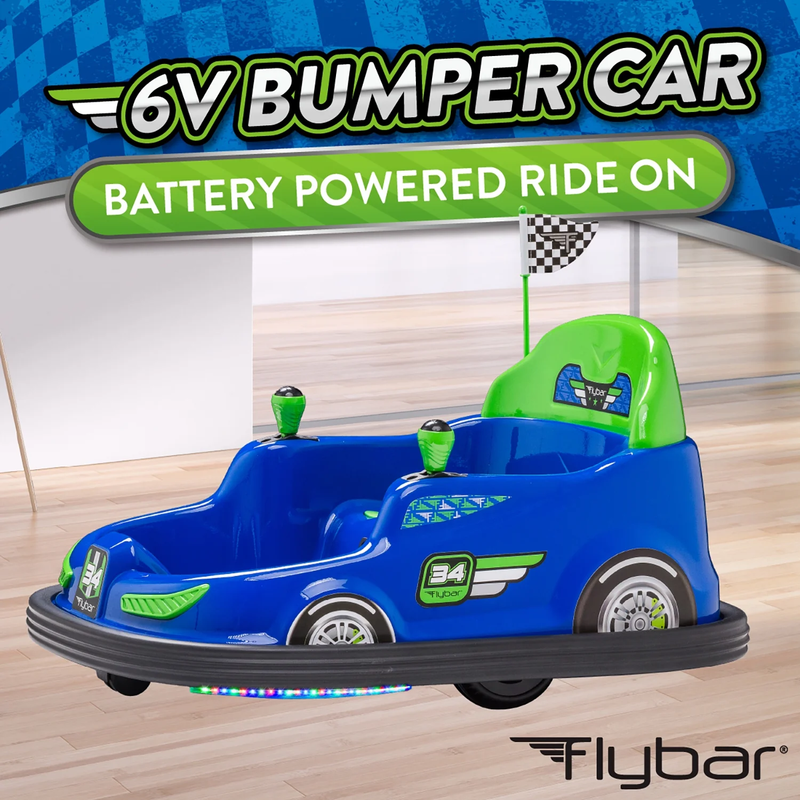 Flybar 6V Bumper Car Powered Ride-On, Blue: Kid Trax 6V Bumper Car delivers 360 spin fun kids love Bright multicolor LED lights add excitement to every ride Soft bumpers protect during gentle indoor or outdoor impacts Easy dual joystick controls for smooth steering and movement Includes Kid Trax 6V rechargeable battery and charger Safety seat belt keeps little riders secure and confident