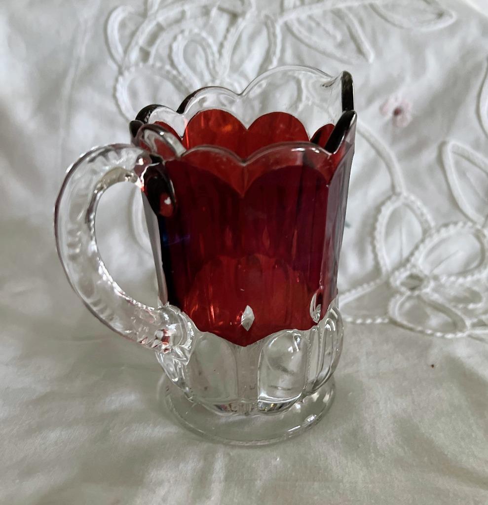Vintage EAPG Ruby and Clear Glassware Creamer Scalloped Rim Ornate Handle