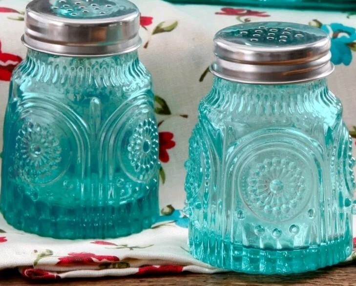 Pioneer Woman ~ ADELINE ~ Embossed ~ Glass ~ Turquoise ~ Salt & Pepper Shakers